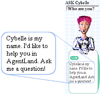 | Cybelle est votre guide virtuel sur AgentLand : elle est l� pour vous aider, vous informer, vous guider dans le site. Pour lui poser une question, il suffit d'utiliser la zone de saisie situ�e juste au-dessus d'elle et de taper votre question en plein texte. |